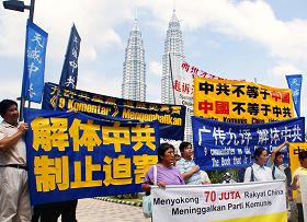 上午十一点,退!党!服务中心义工和支持者来到斌再路,游客观赏马国著名地标建筑--双峰塔的广场上集会。他们举着“声援7千万中国人退出中共恶党”、“天灭中共,天佑中华”、“中共不等于中国,中国不等于中共”、“解体中共,制止迫害”等中文、马来文、英文横幅。