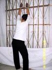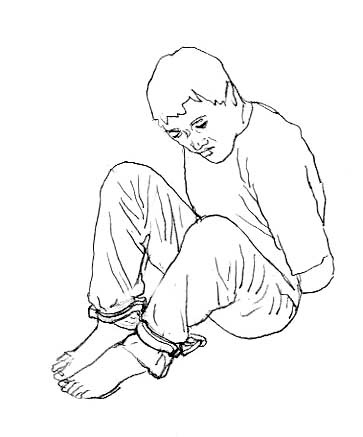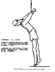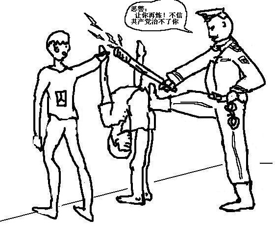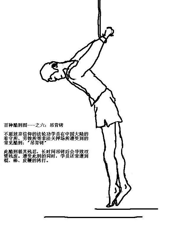 次日(9月20日),狱警熊敏、万敏英又来喝问我:“‘四书’写好了没有?是不是你自己写的?”我说:“我的手不能动弹,哪能写字?是她们抓住我的手写的。”万敏英一听,怒问我:“什么!什么!”并吼道:“走!走!下楼去!下楼去!”又把双手完全瘫痪的我拖到19日吊铐我的原处,以同样手段又反手喷气飞机式从8时吊背铐到11时多,持续再反手悬吊铐了3个多小时,使我更是雪上加霜。把我摧残得呼吸困难,差点断气。