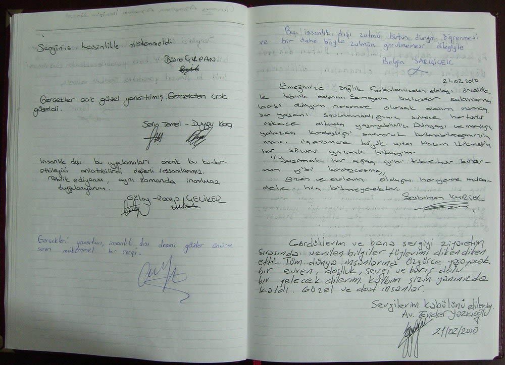 在一家大医院任妇产科主治医师的阿伊菲女士(Dr. Ayfer),头一天自己参观完画展后,第二天把很多亲戚和朋友都带了来。阿伊菲女士在画展留言簿上这样写道:“人们仅仅因为学炼一种有益于健康和道德提升的功法,便遭到如此惨烈的酷刑折磨,这实在令我震惊不已。任何人都不应该因为自己的思想和信仰遭受迫害和酷刑折磨。应该早日结束这场迫害。”