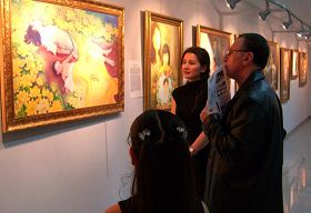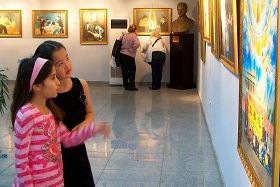 ![]() 年仅九岁的艾丽芙•丘鲁克(左)与大法小弟子一同观看画展 |