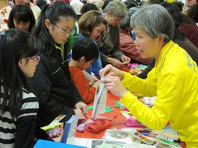 来自兰道尔夫(Randolph)的女士在学习折叠莲花时,听法轮功学员讲述莲花背后“出淤泥而不染”的内涵及法轮功学员在中国遭受暴行迫害而依然坚定对“真、善、忍”的信仰时,表示非常钦佩法轮功学员的毅力。她的双亲早期在大陆传教,后被中共打压迫害直至被迫离开中国大陆。她知道共产党的流氓本性。