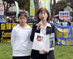 戴志珍表示,当她的丈夫九年前被迫害致死时,她的女儿法度仅仅几个月大。现在法度已经几乎快跟妈妈一样高了,但中共对法轮功的迫害仍在持续。她说:我们在这里,代表成千上万被拆散的家庭。我的女儿代表着成千上万父母被迫害致死的孩子。他们的眼泪没有人看到。