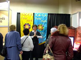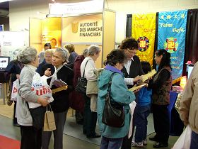 与外婆一起来弘法的九岁小弟子金子晶用法语向当地的法裔人介绍法轮功,小小年纪有条不紊,从法轮功的功法到书籍一样一样地介绍,最后还不忘强调宣传单上的法轮大法网站的网址。人们表示回去将上网进一步了解法轮功。