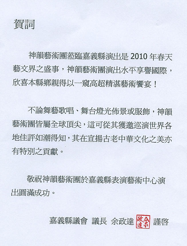 嘉义县议会议长余政达在贺词中表示:神韵艺术团莅临嘉义县演出是二零一零年春天艺文界之盛事,神韵艺术团演出水平享誉国际,欣喜本县乡亲得以一窥高超精湛艺术飨宴!不论舞艺歌唱、舞台灯光布景或服饰,神韵艺术团皆属全球顶尖,这可从其获邀巡演世界各地佳评如潮得知,其在宣扬古老中华文化之美亦有特别之贡献。敬祝神韵艺术团于嘉义县表演艺术中心演出圆满成功。