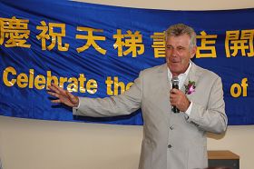 ![]() 纽省法轮佛学会发言人约翰.戴乐在澳洲首家天梯书店开幕式上致词 |