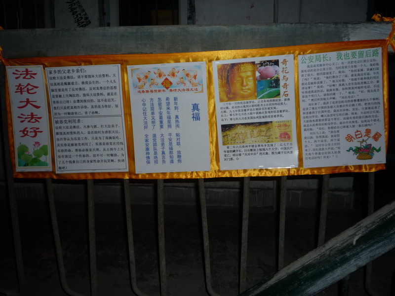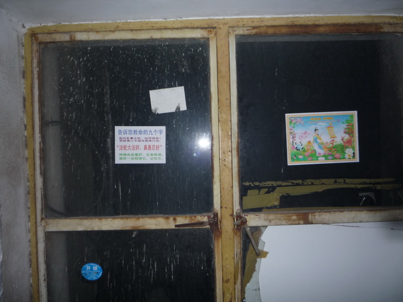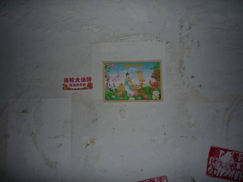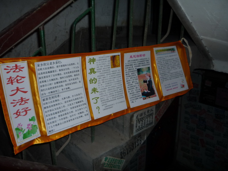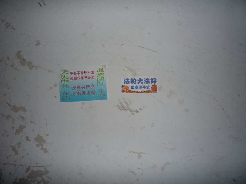 【明慧网二零一零年三月八日】图为2010过年期间天津市居民楼道内出现的真相粘贴和横幅。