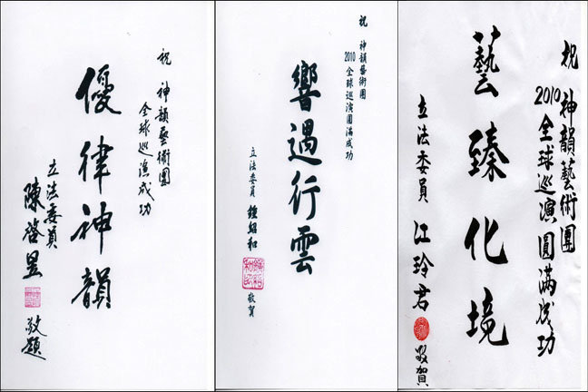 高雄县长杨秋兴发来演出贺词:“艺术是人生的美好飨宴,神韵艺术团宣扬中华文化的舞蹈之美不遗余力,今年又增添交响乐团的随团来台演出,相信可以提供更多元、更丰富的艺术内涵给广大的艺术爱好者。预祝今年演出成功!”
