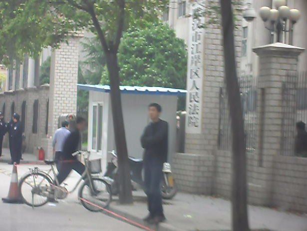 四月七日,一大早法院门口临时拉起了警戒线,布置了公安,便衣四处打探,江岸区“六一零”(江氏为迫害法轮功专门成立的凌驾于法律之上的机构)洗脑班的车也开到法院,准备随时抓人。国保特务拿着摄像机对着法院大门拍照,如临大敌。路人避之唯恐不及,这一天,江岸区法院成了是非之地。可笑的是此时在法院门口一个临时布告栏还歪歪斜斜的贴着公开开庭的公告。过了一阵,便衣们折腾累了,到房子里休息去了;门口的公安也懈怠了,开始聊天。看到这个场面真是:虚张声势,自己吓唬自己。