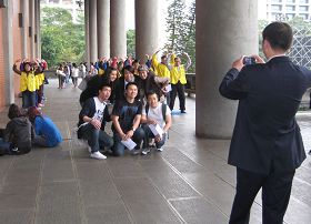 经常来此的民众以及带团导游不难发现,近一年以来,无论阴晴寒暑,每天总有那么一群法轮功学员,身着写有“真、善、忍”的金黄色背心,在纪念馆正门右侧回廊的左右两边炼功。民众依然来往于空出的中间走道,休闲行止不受任何影响。反倒是祥和悦耳的炼功音乐以及宁静殊胜的场景,成为过往民众目光聚焦的亮点。游客拿起相机拍照已是司空见惯,也常有兴趣盎然地与炼功场景合照的情形发生。每天时常可见的是游客如被磁铁吸引般的注视,来自大陆的观光客有的利用入出纪念馆之际不时回头探望,越来越多人则站在炼功队伍面前直接观看。