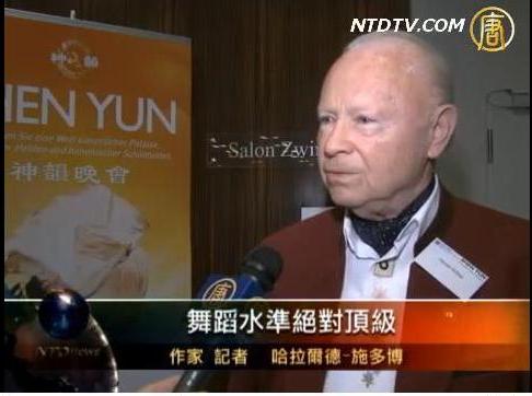 德国作家哈拉尔德·施多博博士(Dr. Harald Stöber)和夫人希尔迪佳德·施多博(Hildegard Stöber)曾去过世界上一百六十多个国家,也去过中国五次,但是他从未看过神韵这样的演出:“演出令人出乎意料!服装色彩斑斓,舞蹈技巧是绝对的顶尖,绝对顶尖!这样的演出我还从来没见到过,在中国也没有,这里当然也没有。我得说,这场演出值得称赞,非常值得大大地称赞。演出太精彩、太迷人了。”