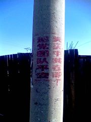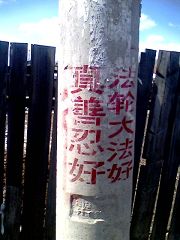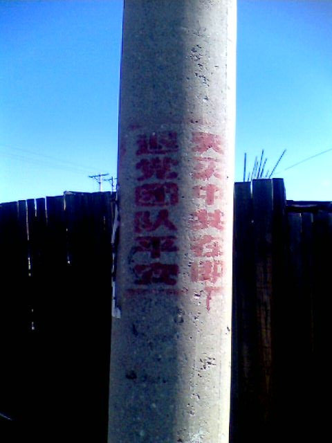 黑龙江北部居民区、公路、铁路旁,房屋边等处的水泥电线杆上,都喷有红色的“法轮大法好”、“真善忍好”、“天灭中共在即,退!党!团队平安”的红色油漆大字。这些真相历经八个多月了,字迹仍然清晰,颜色不退,在蓝天、白雪的映衬下更加鲜艳夺目。