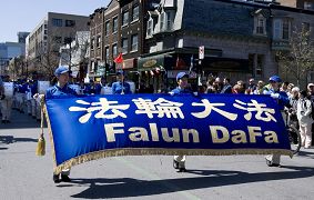 蒙特利尔天国乐团活动协调人介绍,在游行前两天我们接到组委会提出的要求,游行期间不能打出“法轮大法”的横幅。我们马上回复组委会,“法轮大法”横幅是我们乐团的一部份,不让打这个横幅,是对我们这个团体的歧视,我们就将不参加这次游行,同时保留法律诉讼权利。最后组委会决定可以打出“法轮大法”横幅。