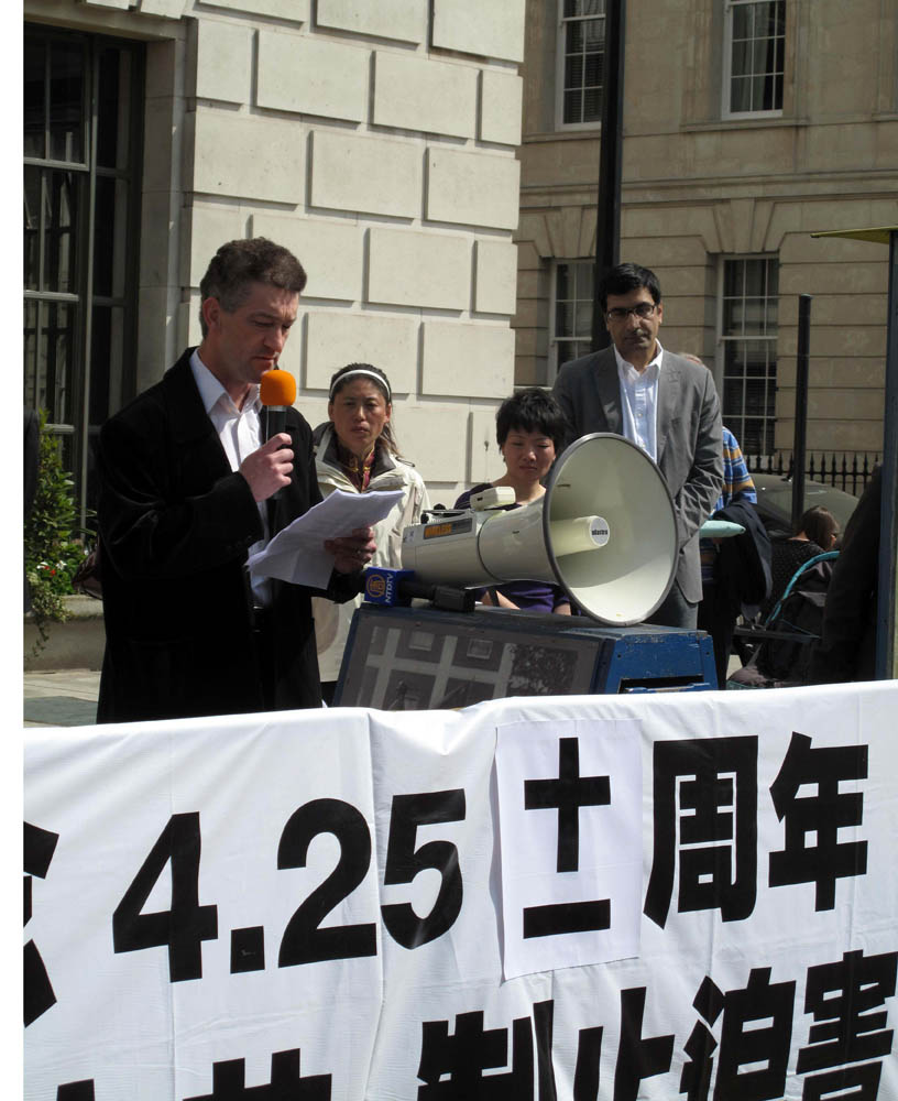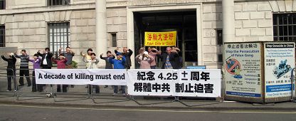 在“四•二五”法轮功学员和平上访11年后的今天,中共陷害法轮功的弥天大谎还在继续,对中国大陆的法轮功学员的残酷迫害还在持续甚至加剧,但法轮功学员的真善忍信仰更加坚定。与此同时,多年来海外法轮功学员同样秉承真善忍信念,面向各国民众长期坚持平和、理性的讲真相,努力帮助世人认识中共的真实面目,目前包括英国在内的海外法轮功学员正在鼓励政府、机构、企业和个人尽快了解法轮功真相,共同采取行动解体中共邪*党-制止迫害。