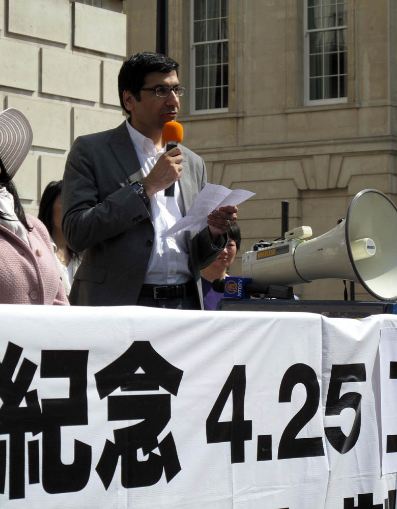 ![]() 英国法轮大法学会主席彼得•贾浩在集会上发言 |