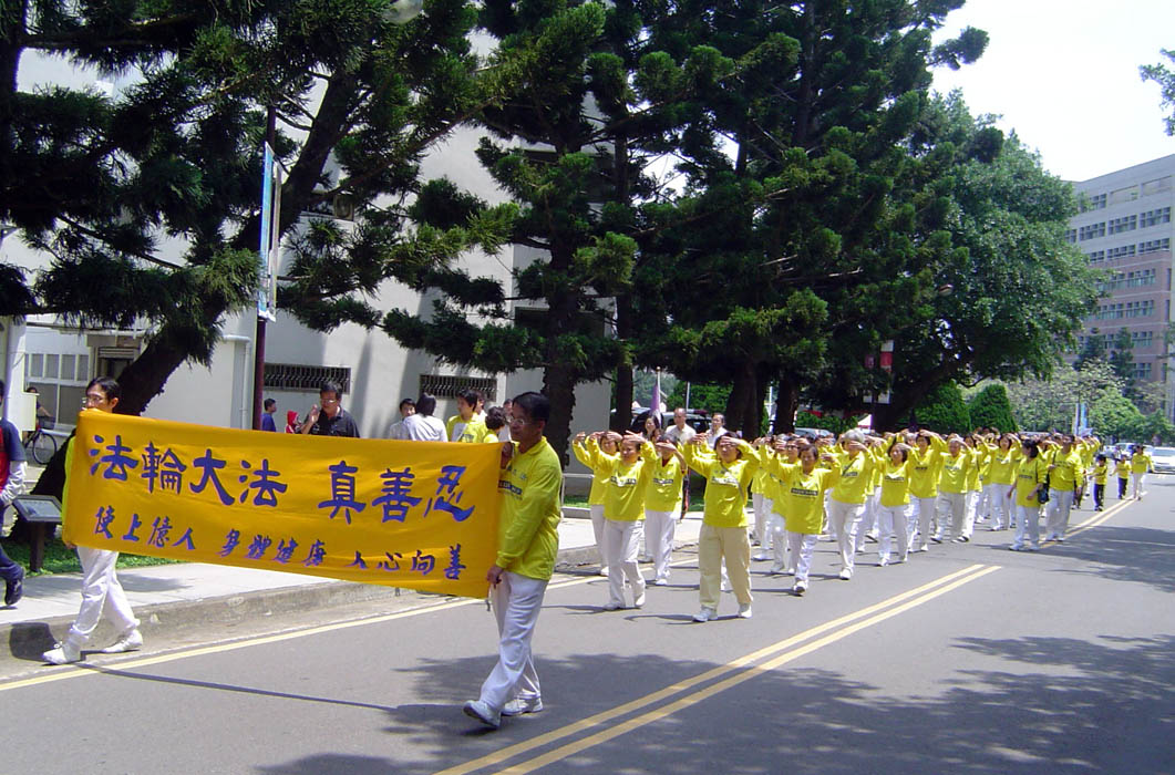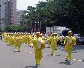 为热烈庆祝清华生日,法轮大法社的学生们邀请了附近地区的法轮功学员共同参与。活动从游行开始,以腰鼓队领头,功法表演队伍紧接其后,从校门口的大草坪游行至水木餐厅前的溜冰场。身着金色服装的腰鼓队表演《法轮大法好》、《喜鹊》、《鼓乐神威》、《福》曲目,金色耀眼的队伍加上精神抖擞的鼓声,吸引了不少目光,为清华校庆增添喜气与活力。功法表演队伍行进时演示着法轮功的一至四套功法,以舒缓的炼功动作分享身心轻松的自在。