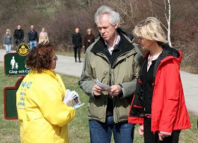 很多路人经过这里都停下了脚步,上前询问发生了什么事情。一对瑞典夫妇跟学员交谈了很久,他们说,我们每年都看到你们在这里,你们做得很对,得知中共对法轮功如此残酷的迫害已经十一个年头了还在继续,他们很是气愤。他们问我们能为你们做点什么来帮助你们?”最后他们表示要告诉更多的瑞典人这场发生在中国对人权的残酷迫害。