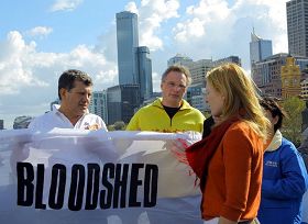 樊先生说:“十一年过去了,中共对法轮功的 迫害还在继续。很多人都感到不可思议, 不敢相信横幅上展示的这一切还继续发生在当今社会,震惊之后纷纷表示愿意支持和帮助法轮功。我们告诉这些民众,希望他们能让自己的家人和朋友也了解中国法轮功学员被迫害的真相。我们也呼吁澳洲政府能发出正义的声音,帮助尽快停止迫害。现在已经有越来越多的国家加入了谴责中共残酷打压法轮功和其他信仰团体的行列。”