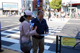 下午两点半左右法轮功学员和部份正义民众开始从惠比寿公园出发到六本木的一个多小时的游行,游行队伍由天国乐团做先导,随后是身着白衣、手捧被迫害致死的法轮功学员遗像的女学员方阵,以及展示法轮功学员遭受残酷迫害照片的看板的队伍,人们手举“纪念四•二五和平上访十一周年,停止迫害法轮功”等中日文横幅,扩音器里反复用日文播送此次活动的目的、什么是法轮功和法轮功遭受迫害的情况,向路人传达真相。游行队伍途经热闹繁华的市中心,引起路人的关注,很多人默默地驻足观看,有人关切地询问,对仅仅因为修炼法轮功竟然遭到残酷迫害的法轮功学员表示同情,对中共的做法表示不解和愤怒。