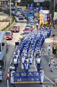 一个多小时的集会结束后,游行在下午两点半开始,在天国乐团的领头下,四百多人的游行队伍途经铜锣湾、湾仔和中环,向中联办进发。