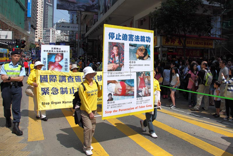 ![]() 游行队伍展示呼吁停止迫害法轮功的展版。 |