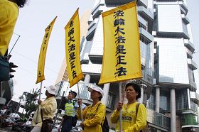 ![]() 游行的法轮功学员展示“法轮大法是正法”的幡旗。 |
