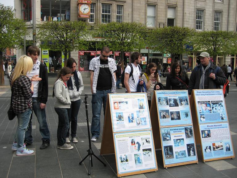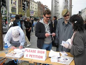 学员们集体炼功的场面使路过的爱尔兰人深受触动,很多人驻足观看良久。祥和的场面和展板上展示的中共令人发指的迫害手段形成鲜明的对比。人们纷纷签名支持法轮功。有的当时就跟着学炼功法。一些中国留学生也静静观看学员们展示五套功法,接过真相资料,仔细阅读展板,并向学员询问了解更多的法轮功真相。