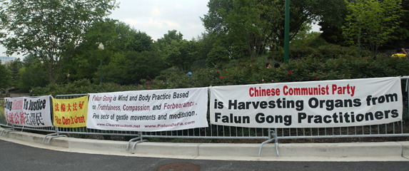 ![]() 中使馆对面的铁栅栏上悬挂着写有“法轮大法好”以及揭露迫害真相的中英文横幅 |