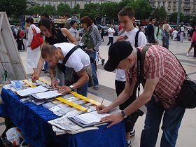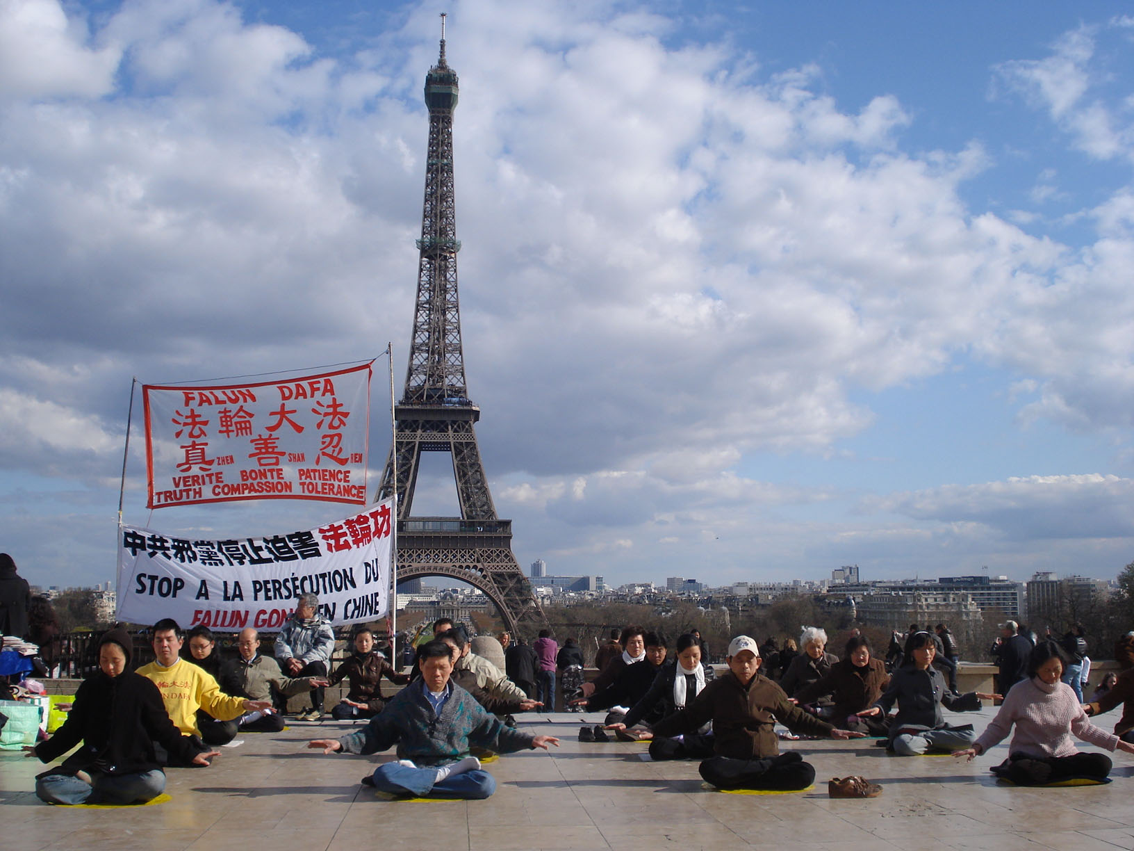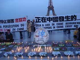 一九九九年七月二十八日,法国的法轮功学员就开始了在法国著名景点之一的埃菲尔铁塔下的人权广场上拉起了“法轮大法好”“停止迫害法轮功”的横幅,向法国政府、法国人民、来自世界各地的游人讲真相。十多年过去了,五百多个周末,无论严寒酷暑、风雪交加都没有动摇法轮功学员的信念:正义必将战胜邪恶,迫害注定失败。