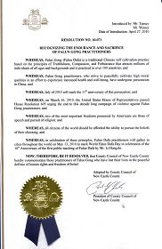 决议提到,“言论和信仰自由是美国人所拥有的两个最重要的自由,全世界的公民都应具有选择他们信仰的自由。为了庆祝(真、善、忍)原则,全世界的法轮功学员将于五月十三日集会庆祝世界法轮大法日,庆祝李洪志先生公开传法十八周年。德拉华州纽卡斯县纪念过去十一年来为和平捍卫人权和信仰自由而遭受中共持续迫害致死的法轮功学员。”