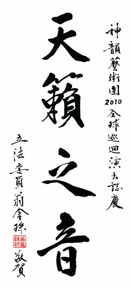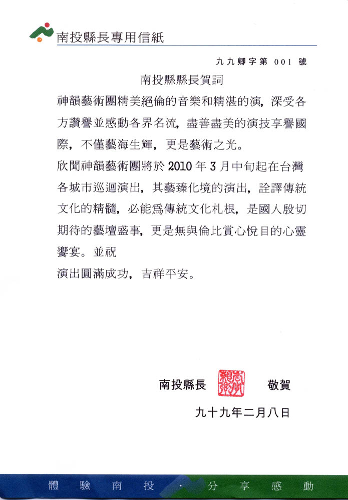 神韵艺术团连续三年在台演出创下一流口碑并引发社会各界热烈回响,彰化县长卓伯源赞誉神韵晚会“华丽传神 韵味天成”;立法委员翁金珠、陈秀卿、郑汝芬、彰化县议会议长谢典等发来贺匾;南投县长李朝卿祝贺称誉神韵艺术团“艺海生辉 艺臻化境”。