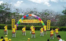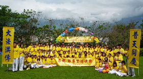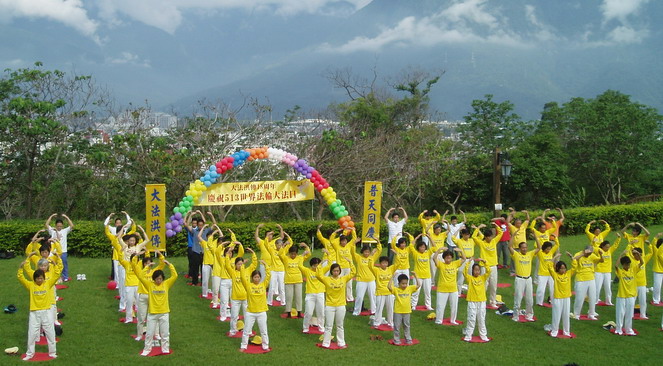 【明慧网二零一零年五月十日】大法洪传,普天同庆。为庆祝法轮大法洪传十八周年,台湾花莲大法弟子于二零一零年五月九日在美仑山公园集体炼功洪法,共同庆祝世界法轮大法日。由于修炼法轮大法后,学员身心受益,不仅身体健康了、心性提高了,更明白生命与修炼的意义,由衷感谢师尊的慈悲救度,藉由集体炼功、表演活动与学法交流等,表达弟子心中的无限感恩,并向世人展现法轮大法的美好。