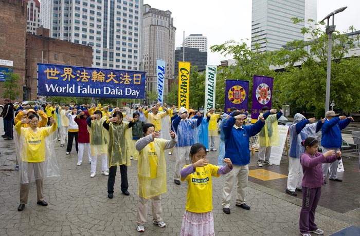 ![]() 波士顿学员风雨无阻庆大法日,祥和平静集体炼功。 |