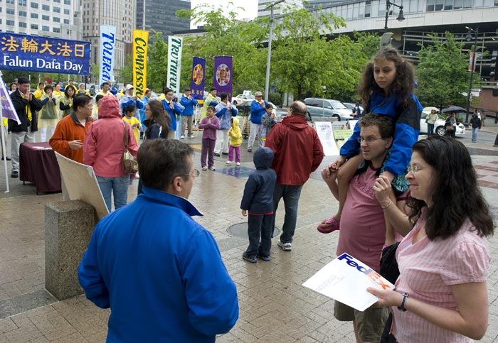 波士顿法轮功学员风雨中展现修炼人的祥和平静、坚持不懈的精神,感动游人。学员自身经历的分享,也让更多人了解法轮功的真相,不再被中共的谎言蒙骗。