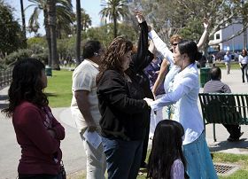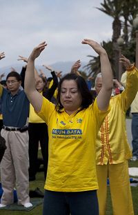 ![]() 洛杉矶法轮功学员在圣塔•莫妮卡海滩集体炼功,庆祝法轮大法日。 |