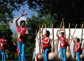 ![]() 明慧小弟子在费城动物园首届亚裔文化节上表演腰鼓“法轮大法好” |