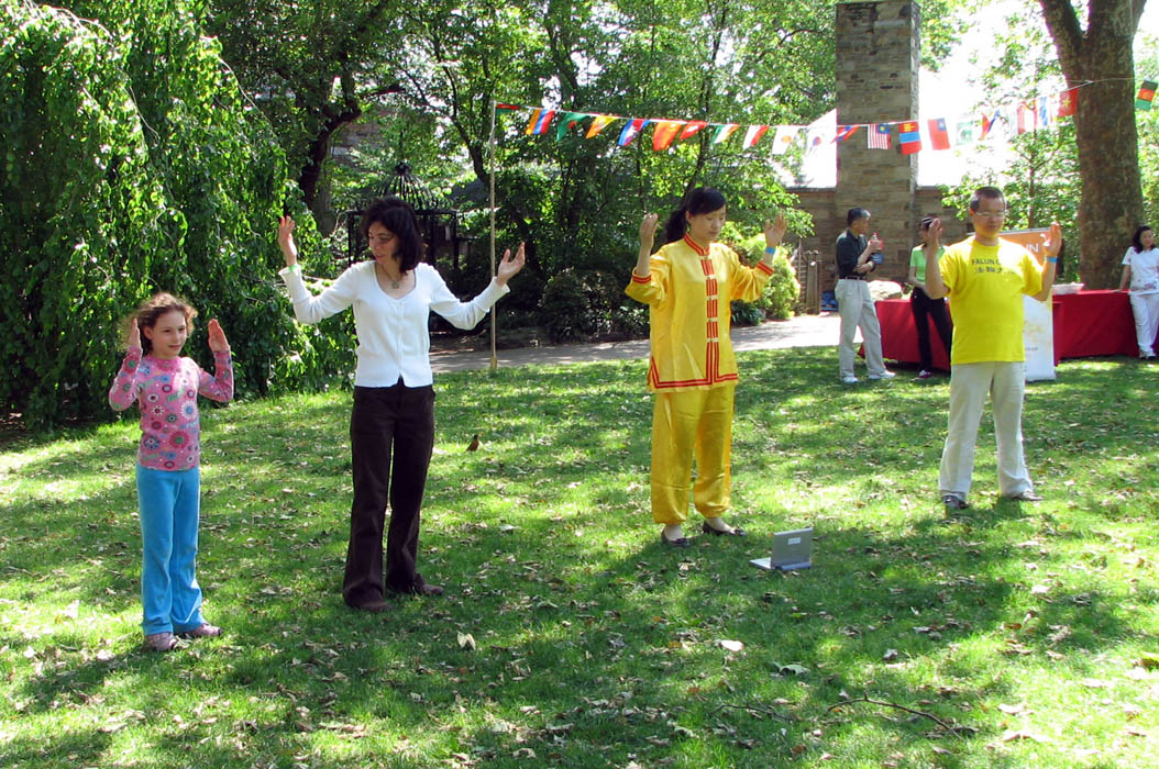 当法轮功学员在台上进行功法演示时,吸引了很多游客在台下跟着学炼。家住德拉华州威明顿市(North Wilmington)的简•史密斯(Jane Smith),一边观看一边模仿炼功动作。她说:“我跟着炼时感觉很好!很容易学。”当得知可从互联网上免费下载教功带及其他法轮功相关资料时,她惊喜地说:“我不敢相信可以免费。一定要去看!”
