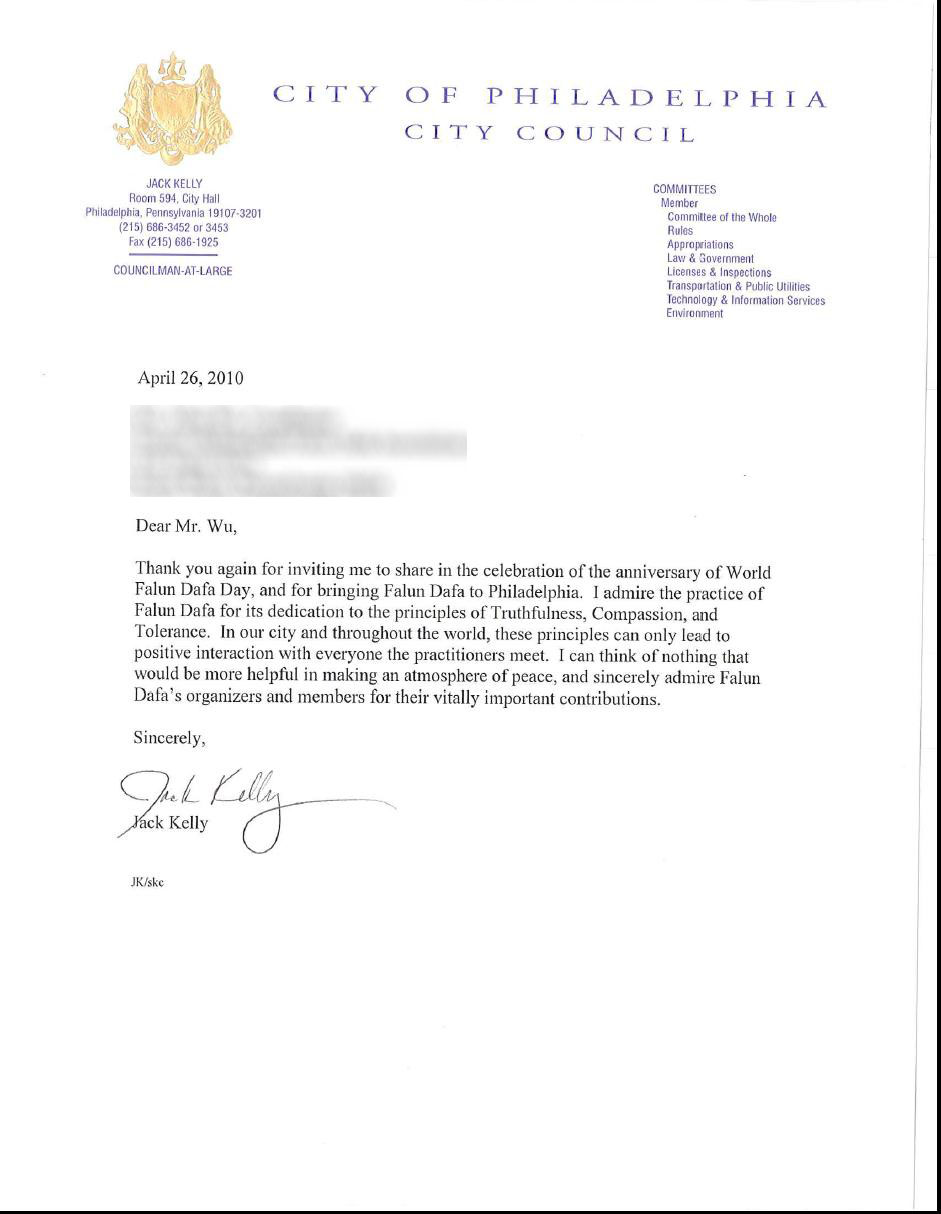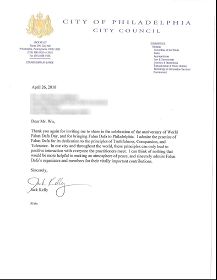 谢谢你们再次邀请我共同庆祝法轮大法日和在费城洪传法轮大法。我敬仰法轮大法的修炼理念:真、善、忍。在费城和世界各地,真、善、忍的准则使法轮大法修炼人给每一位与他们接触的人带来积极向上的影响。这种影响将非常有助于建立和平。我衷心地敬仰法轮大法协会和其成员所做出的这些重要的贡献。