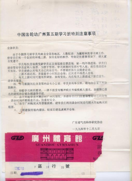 光阴流逝,直到1994年12月第五期学习班开班前的几天,一位朋友手捧着学习班的门票送到我手里,说广州办一个气功学习班,很好的,有一个人订了票现在出差去不了,这张票很难才买到,你去吧。当时我对法轮功的了解只是广告牌子介绍的几句,只记得法轮每天二十四小时转。第一天参加学习班,师父一开口讲课就把我震住了,生命的本源告诉我这就是我要找的。听完第一天的课,我整个人的世界观都变了,这个法太好了!我意识到这个功法的珍贵,意识到这是我生命的重新开始,我下定决心,这辈子就学这个功法了。那张学员证和门票等就成了我最珍贵最值得纪念的物品。就这样,我就一直把她珍藏和保护到现在。