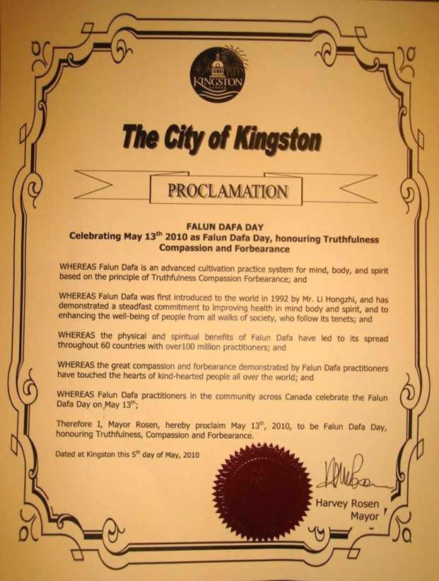 鉴此,我,洛森市长,褒奖二零一零年五月十三日为法轮大法日,暨褒奖真善忍的原则。