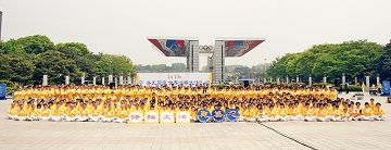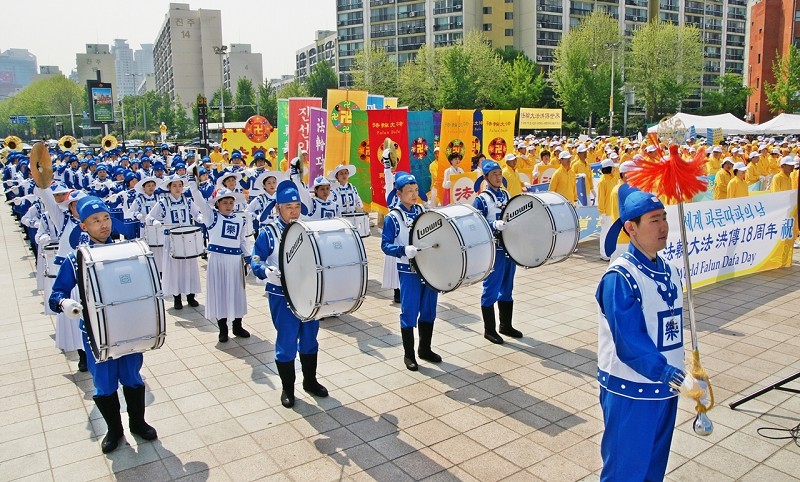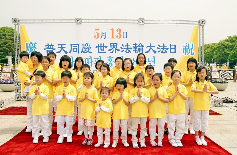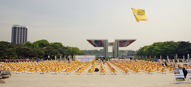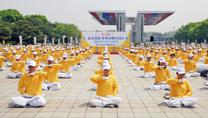 ![]() 法轮功学员在首尔奥林匹克公园庆祝即将来临的“五•一三”世界法轮大法日。图为集体炼功场面。 |