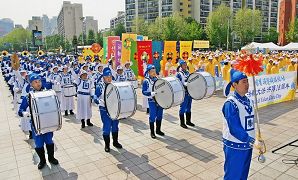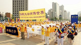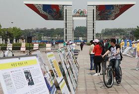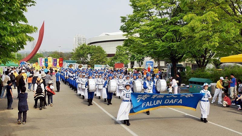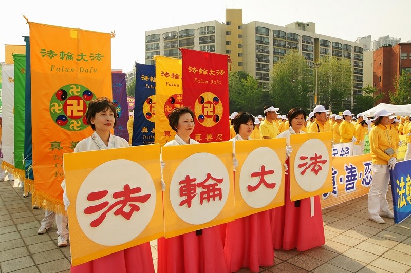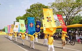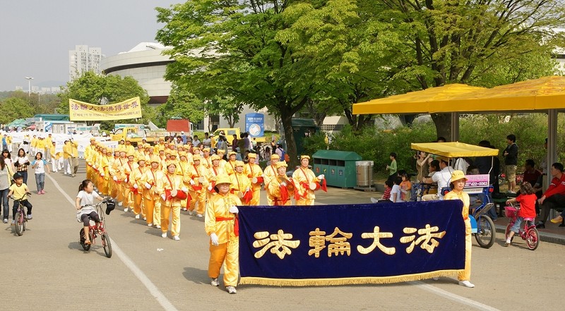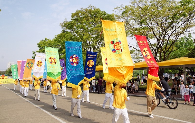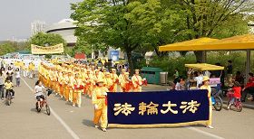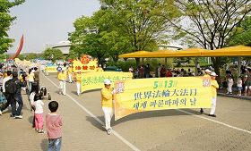 ![]() 韩国部份法轮功学员于二零一零年五月九日齐聚首尔奥林匹克公园举行游行活动 |