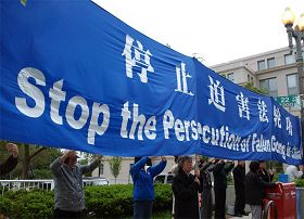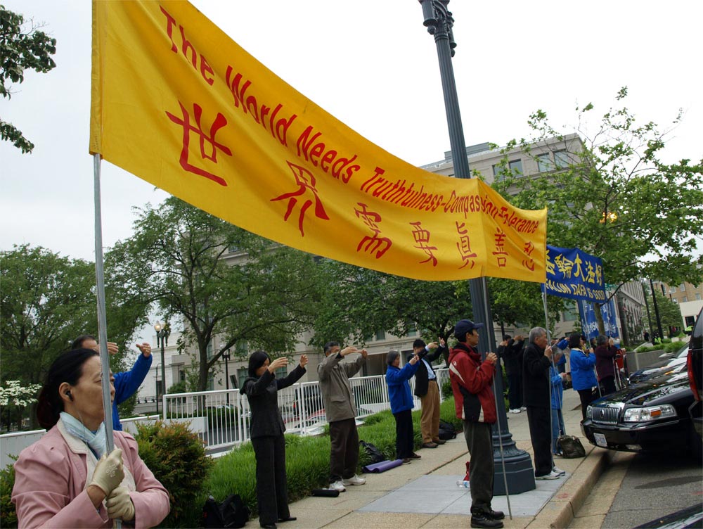 法轮功学员手举写有“法轮大法好”、“世界需要真善忍”、“停止迫害法轮功”等的中、英文横幅,还有一些学员静静地炼功。