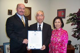 ![]() 参议员麦登向法轮功学员颁发决议正本 |