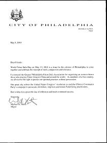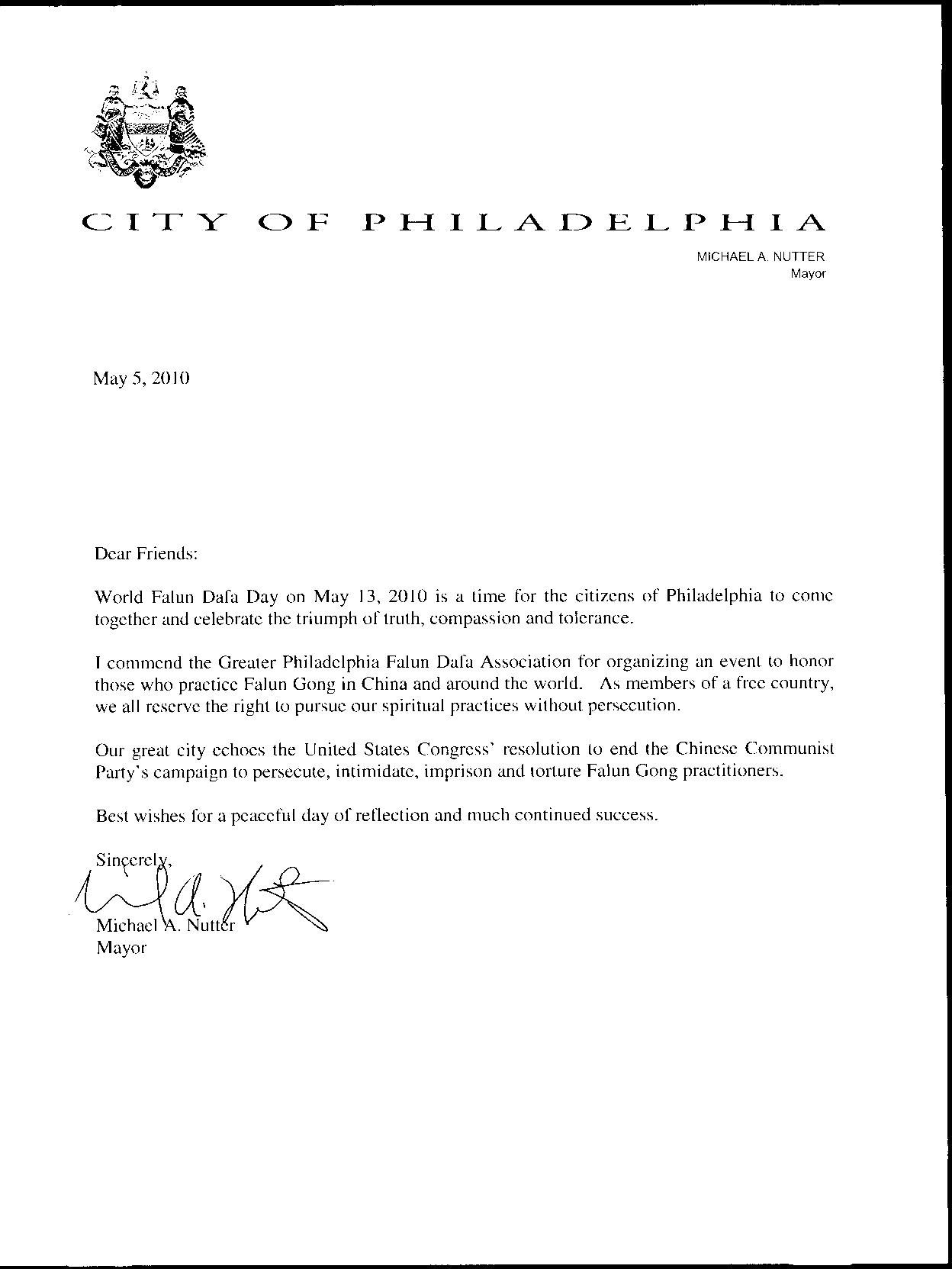 【明慧网二零一零年五月十四日】费城市长迈克尔·纳特(Michael Nutter)二零一零年五月五日致信费城法轮大法学会,祝贺世界法轮大法日。
