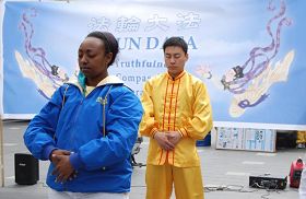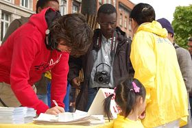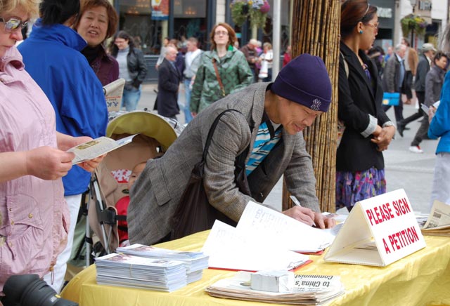 大法弟子用刚劲有力的唐鼓声,驱除邪恶,唤醒世人。欢乐而又祥和的场面吸引了众多的民众驻足观看,很多人签名,表示支持立即停止在中国大陆对法轮功学员的迫害。