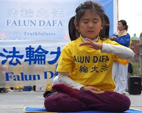 大法弟子们以集体炼功的形式,向世人展示修炼大法的宁静和美好。很多民众一直在静静地观看,感受集体炼功的能量场。