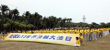 八日,三百多位屏东法轮功学员身着“法轮大法好”黄色上衣齐聚垦丁鹅銮鼻公园,恭祝师父李洪志先生生日快乐,并欢庆第十一届世界法轮大法日,希望把法轮功的美好告诉世人。