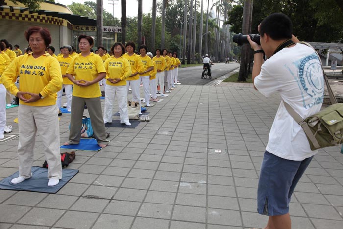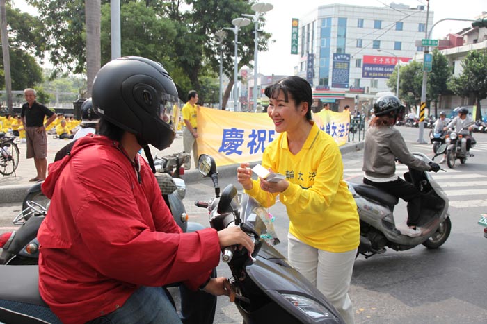 十三日,上百位身着“法轮大法好”黄色上衣的屏东法轮功学员齐聚中山公园,演示功法,随后各学员到附近商家发特刊及分享大法的美好。