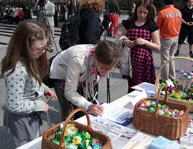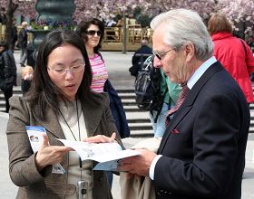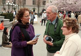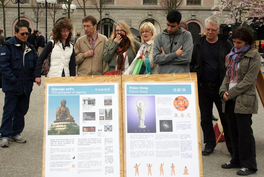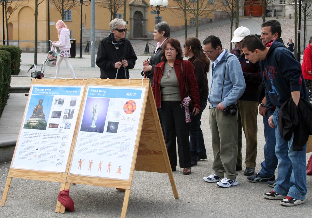 ![]() 人们在展板前了解法轮功及其在中国受迫害的真相 |