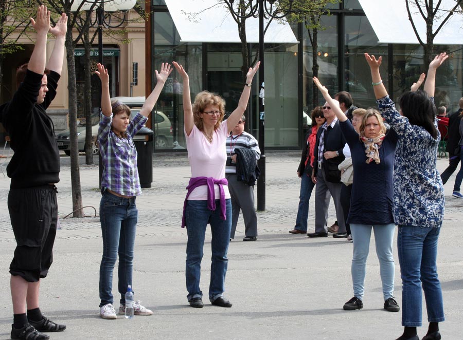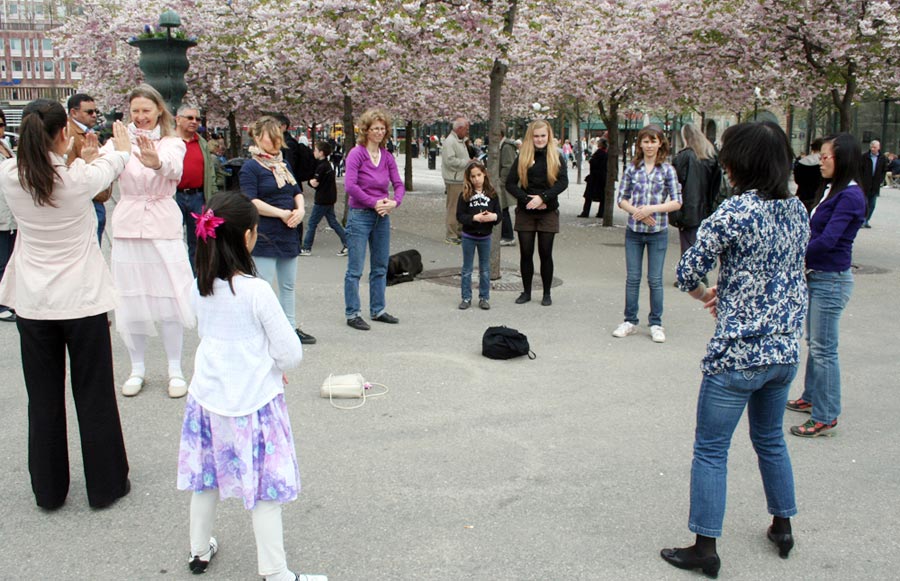 这天正值国王花园樱花盛开的时节,来这里赏花的人们络绎不绝,不少瑞典人被法轮功的炼功音乐和舒缓的动作所吸引,加入到学习功法的队伍中。